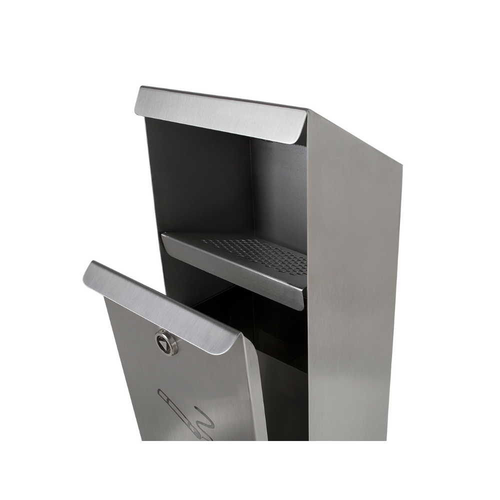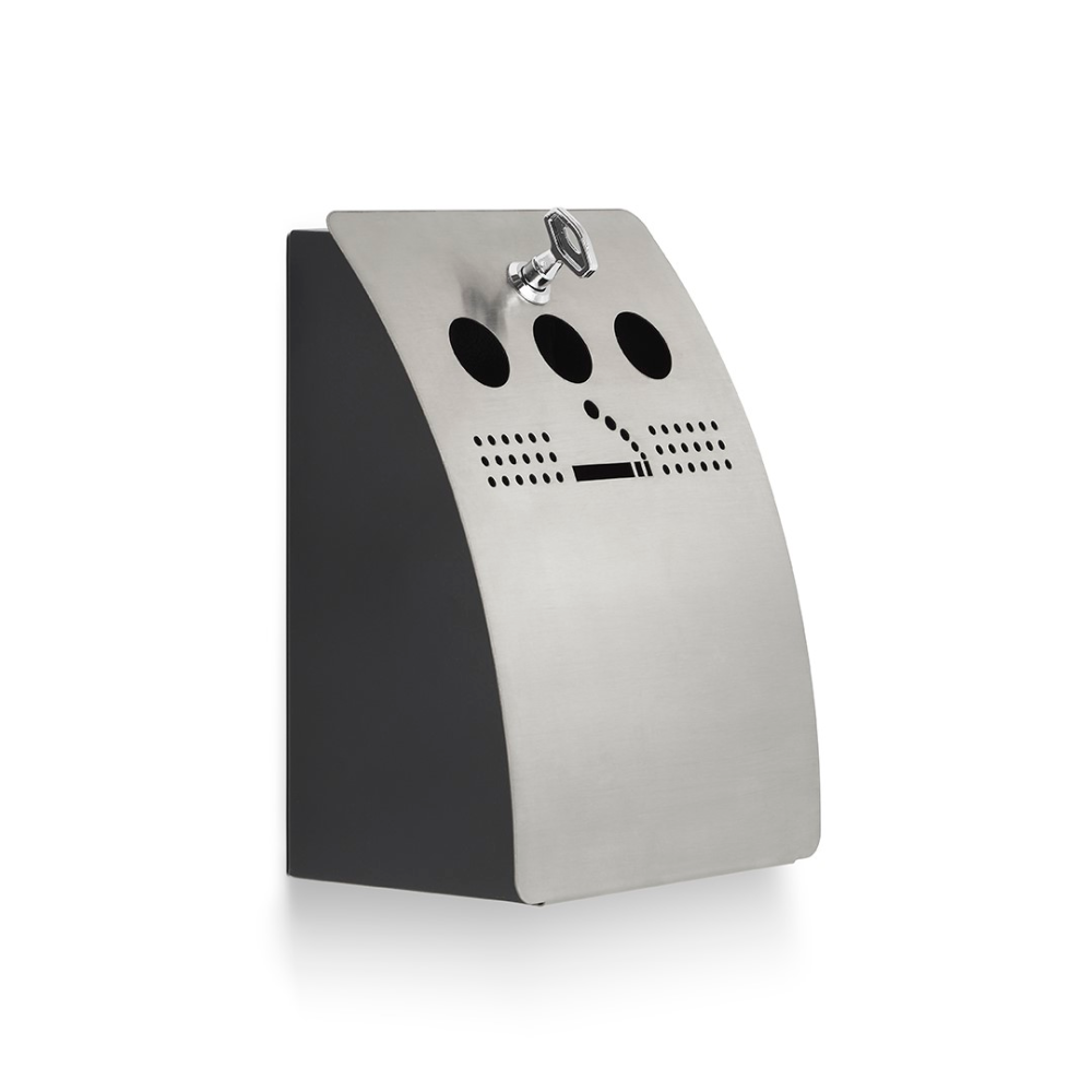 Cenicero de pared de acero inoxidable. Diseño antivandálico. Apto para exteriores, fácil de abrir y limpiar.
