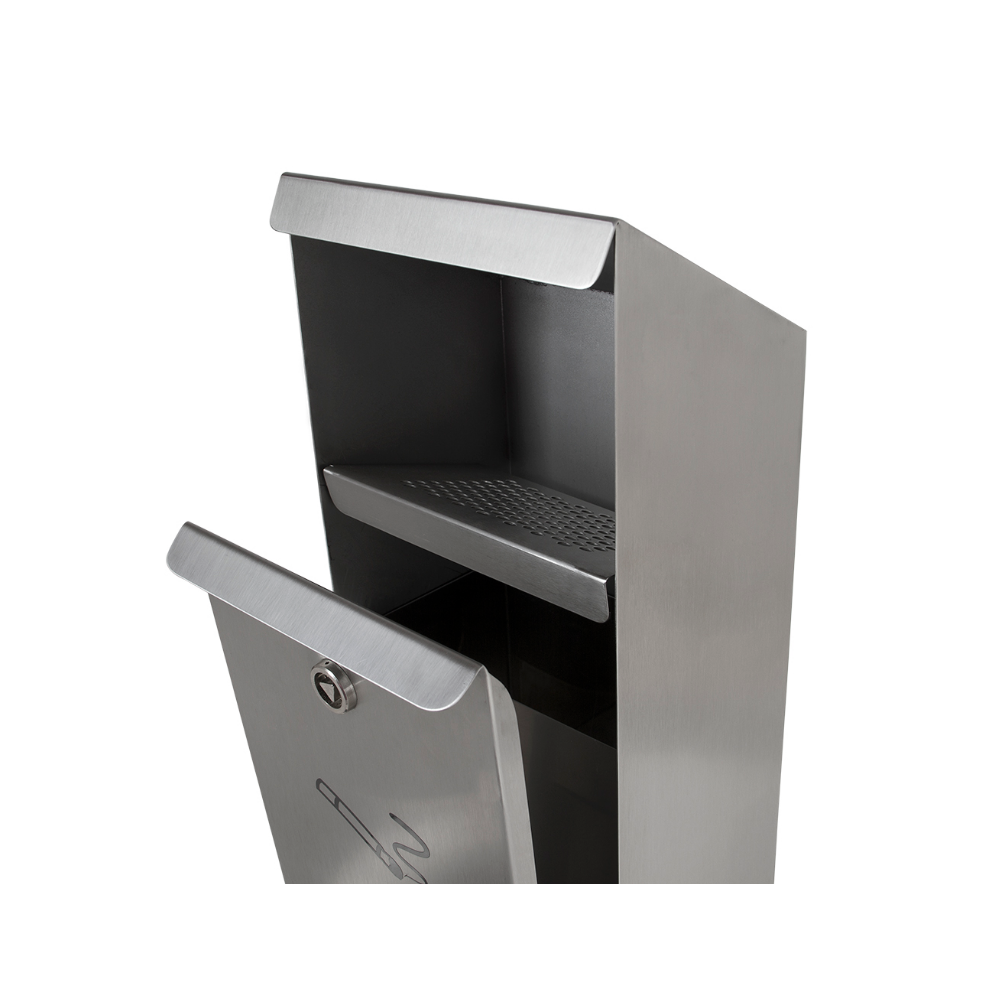Pequeño cenicero de pared de acero inoxidable. Muy discreto, duradero y resistente a la corrosión y a la intemperie.