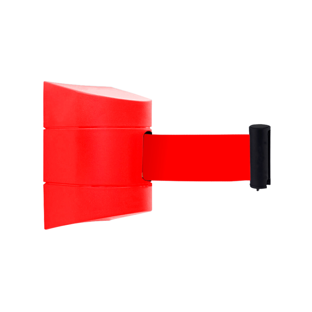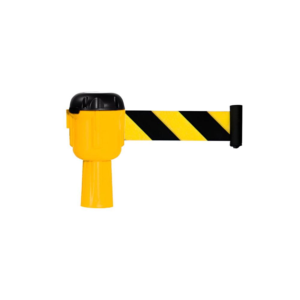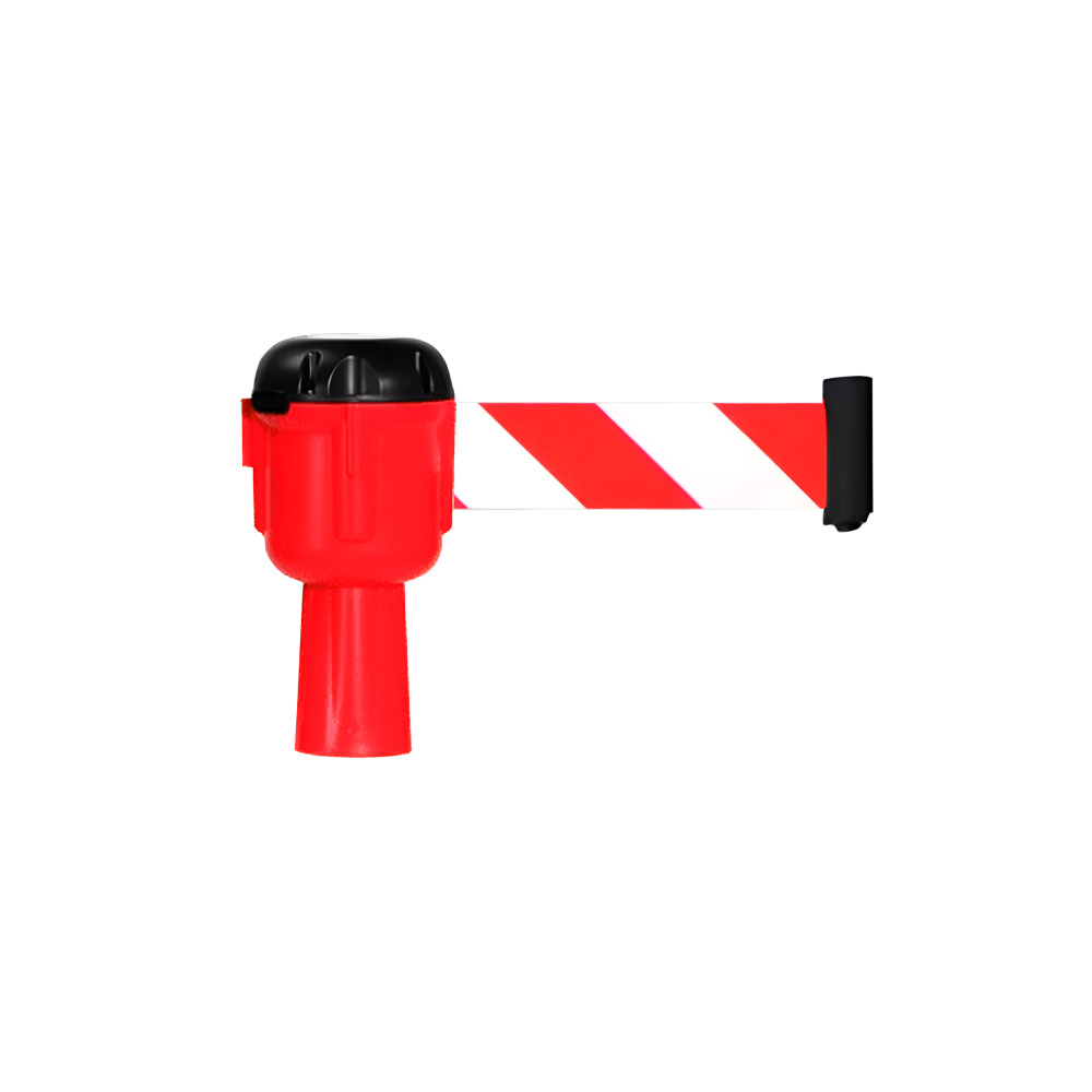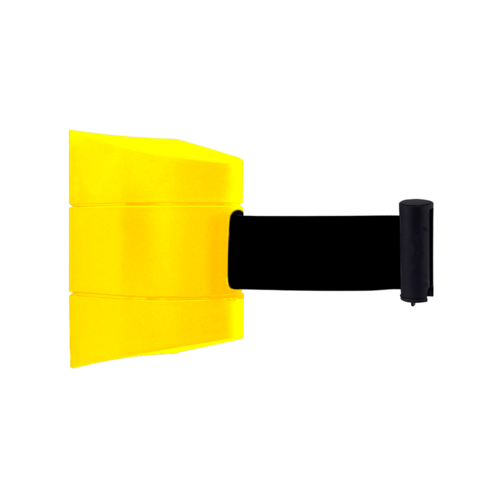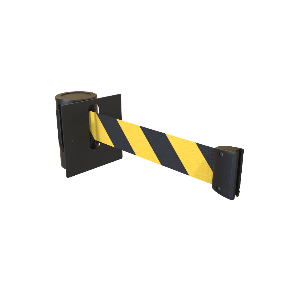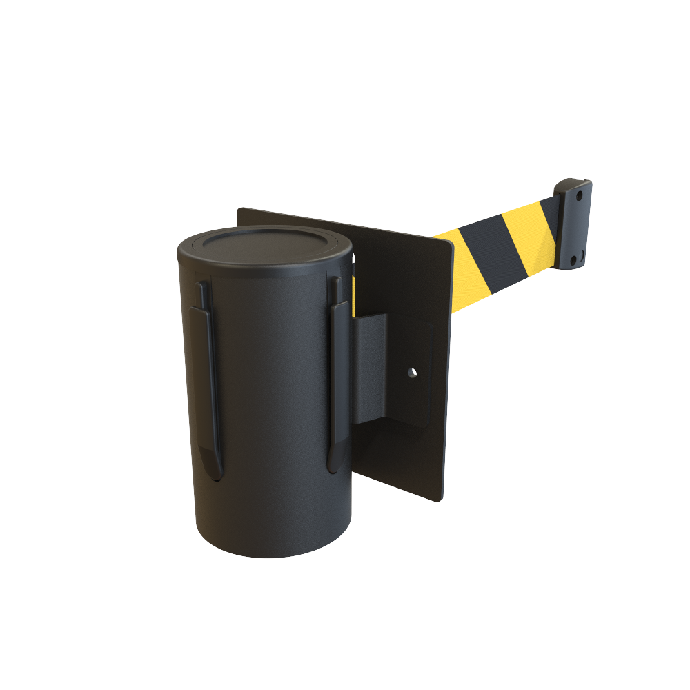 Rodillo de pared de plástico negro, con cinta negra, para unir barreras delimitadoras de 1 cinta, 2 cintas y 1 cinta con base de clip. Puede utilizarse sin barrera delimitadora en aplicaciones más estrechas de pared a pared (por ejemplo, pasillos), en cuyo caso debe aplicarse el soporte de pared de plástico para encajar la cinta retráctil.