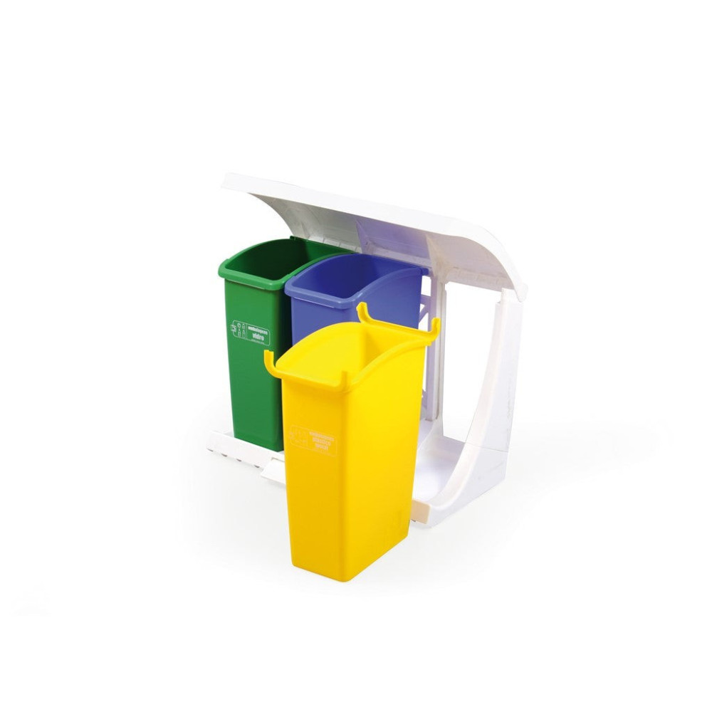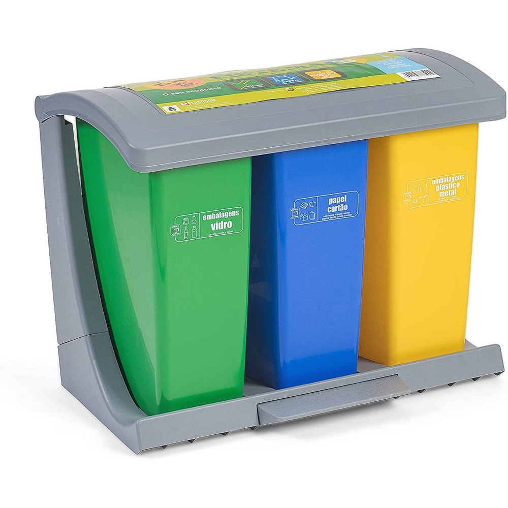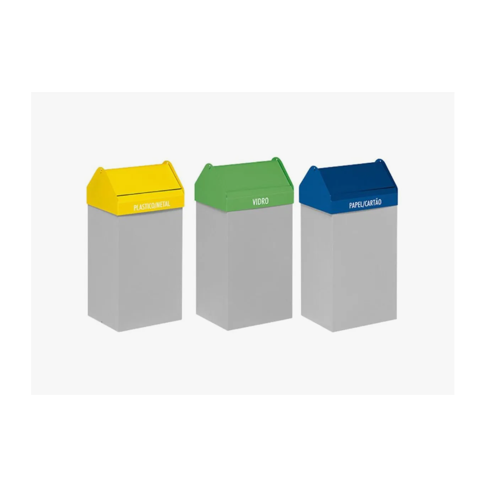 Sistema de reciclagem compacto para uso doméstico, composto por três ecopontos individuais em chapa de aço com tampas “vai‐vem”, ideal para separação de resíduos em cozinhas, garagens ou áreas comuns
