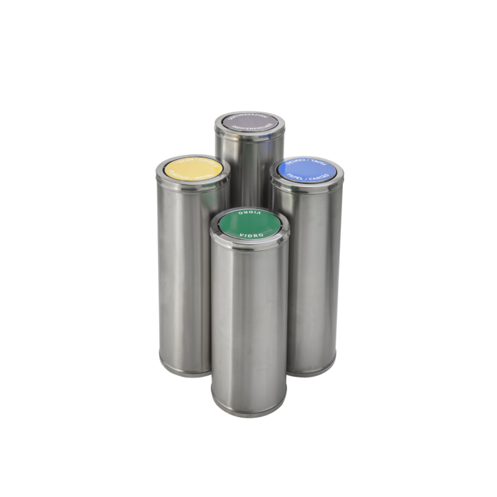 Cada contenedor tiene una capacidad de 40 litros y el bloque es de chapa de acero y pintura epoxi, con el nombre de cada material reciclable en el lateral. Las tapas de este contenedor de reciclaje son abatibles y están pintadas del color del reciclaje selectivo.