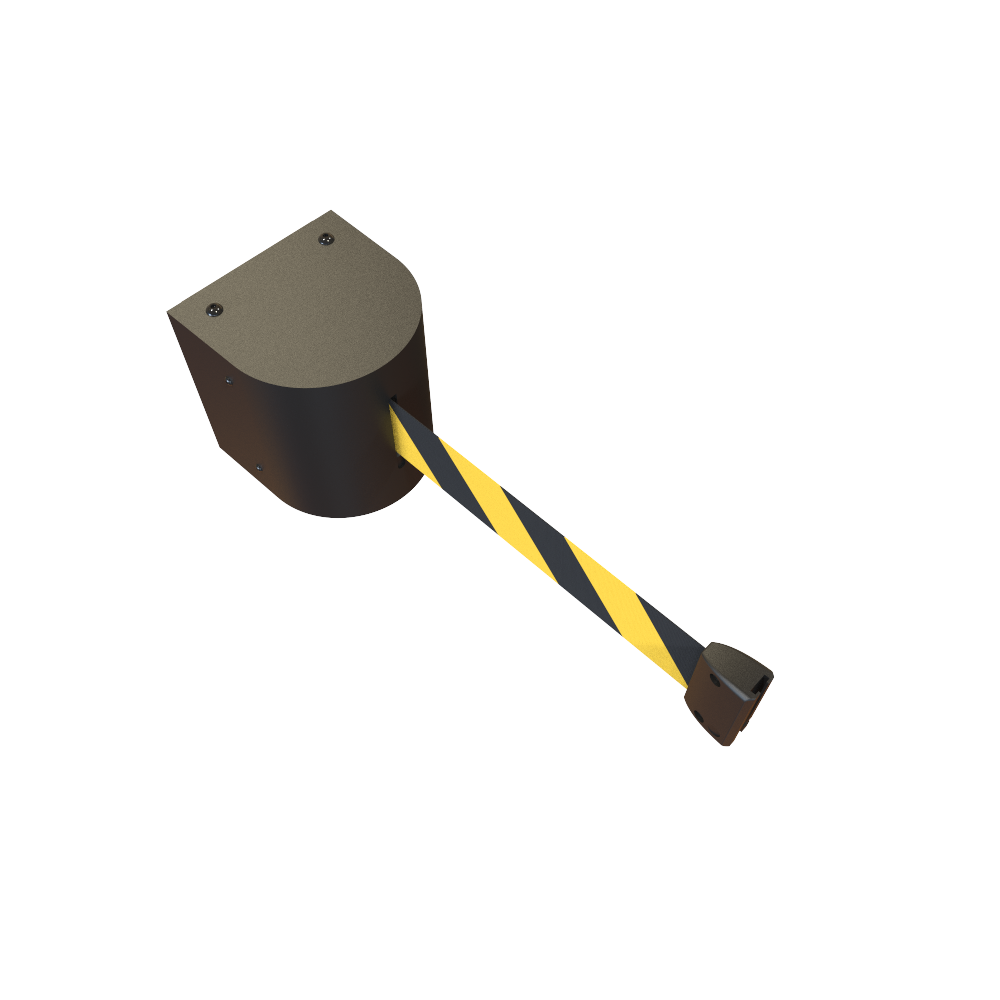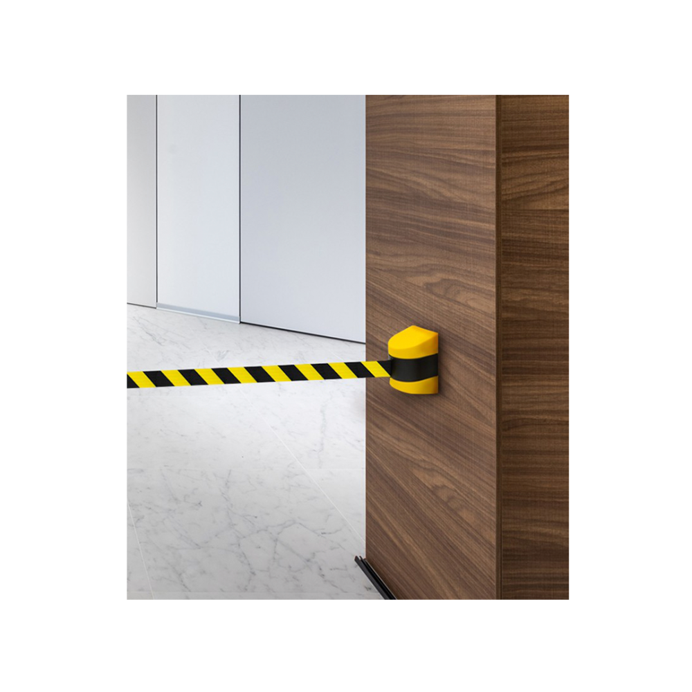 Enrolador de parede em plástico amarelo, com fita preta, para união às barreiras de delimitação de 1 fita, 2 fitas e de 1 fita com base de encaixe. Poderá funcionar sem barreira de delimitação, em aplicações mais estreitas, de parede a parede (ex: corredores), devendo nesse caso ser aplicado o suporte de parede em plástico, para encaixe da fita retrátil.