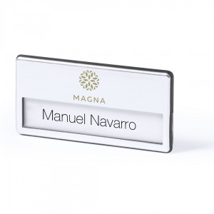Crachá com acabamento brilhante. Parte traseira com sistema de fixação duplo - clipes metálicos e pino de segurança - para ajuste seguro.