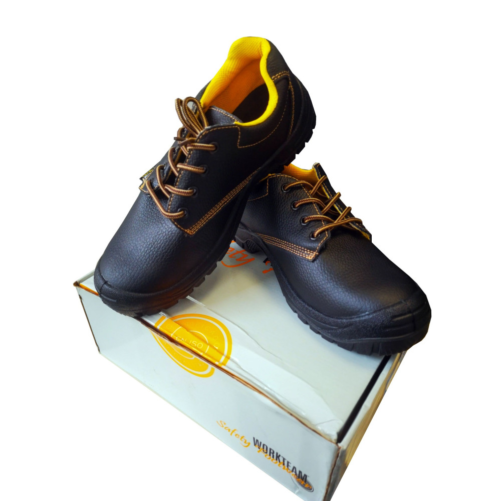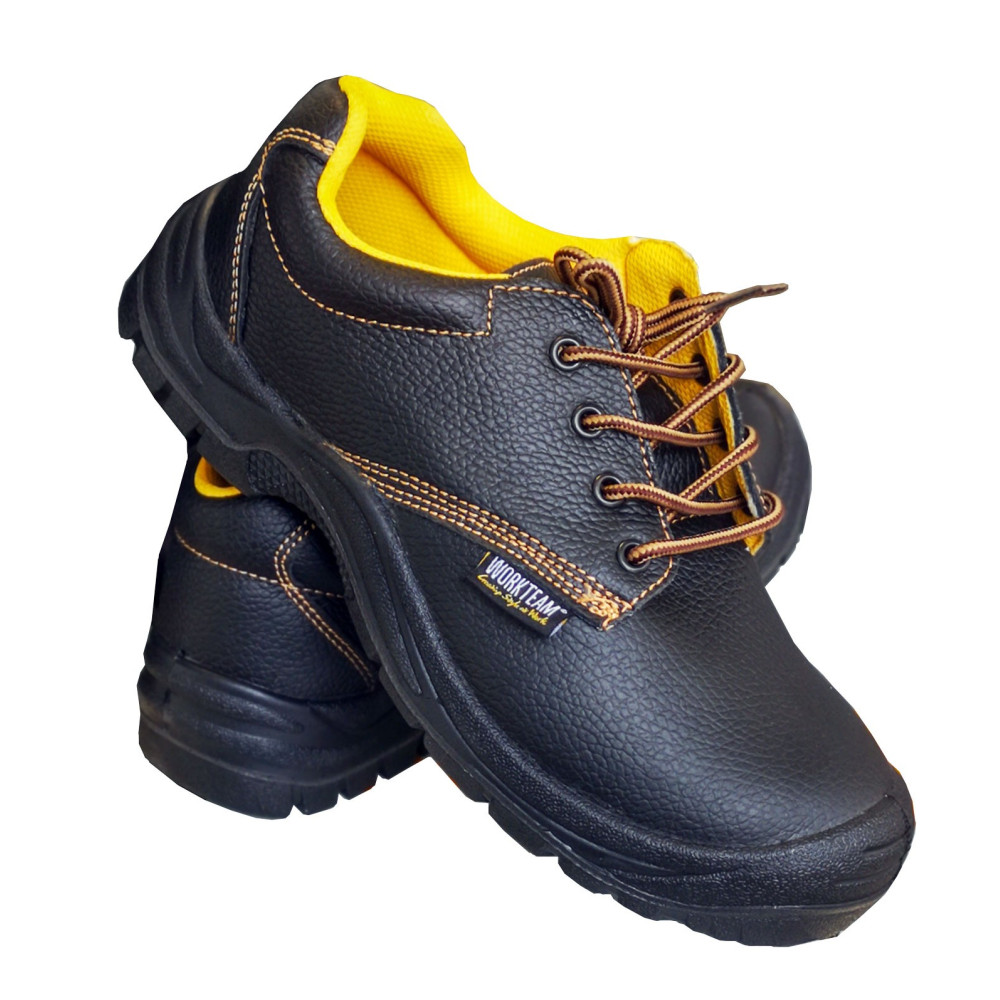 Bota de croute e lona com cordões, biqueira e palmilha de aço.