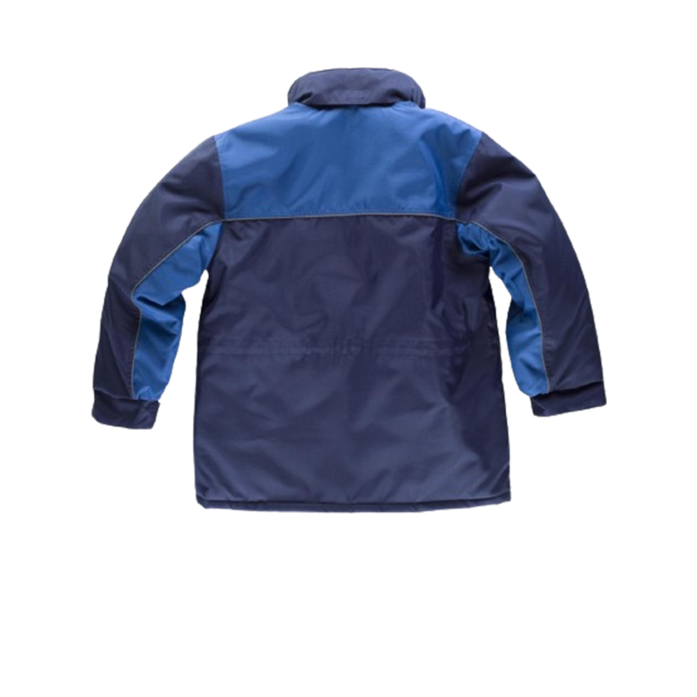 Casaco impermeável em tecido Oxford, combinada com alta visibilidade e faixas refletoras. Gola alta forrada com polar e capuz enrolável com cordão para ajuste.