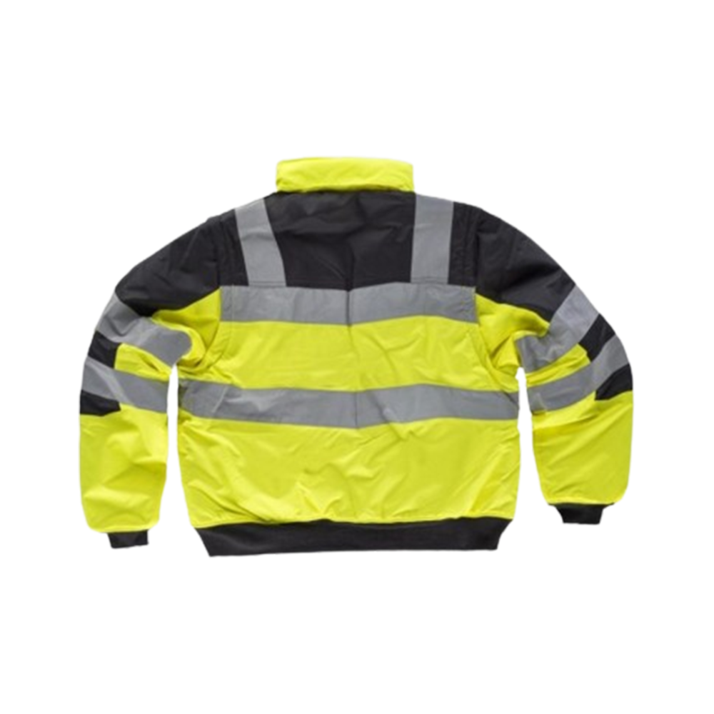 Fecho de correr, pala em contraste, vivos em alta visibilidade.