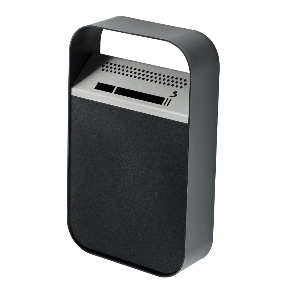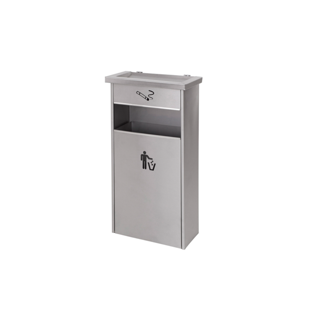 Cinzeiro de parede feito em aço inoxidável. Design antivandalismo. Adequado para o exterior, fácil abertura e limpeza.