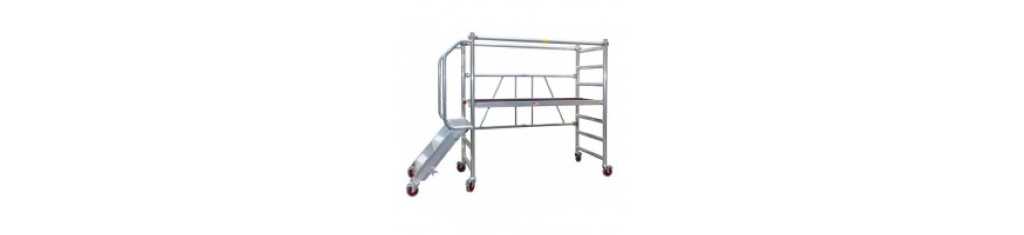 Estas plataformas foram desenvolvidas em alumínio, com ligações horizontais e diagonais instantâneas fixas nos orifícios das escadas através de alavancas expansoras.