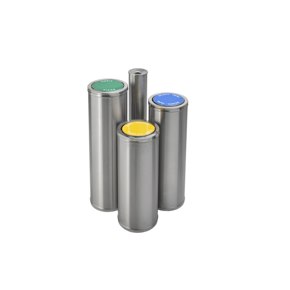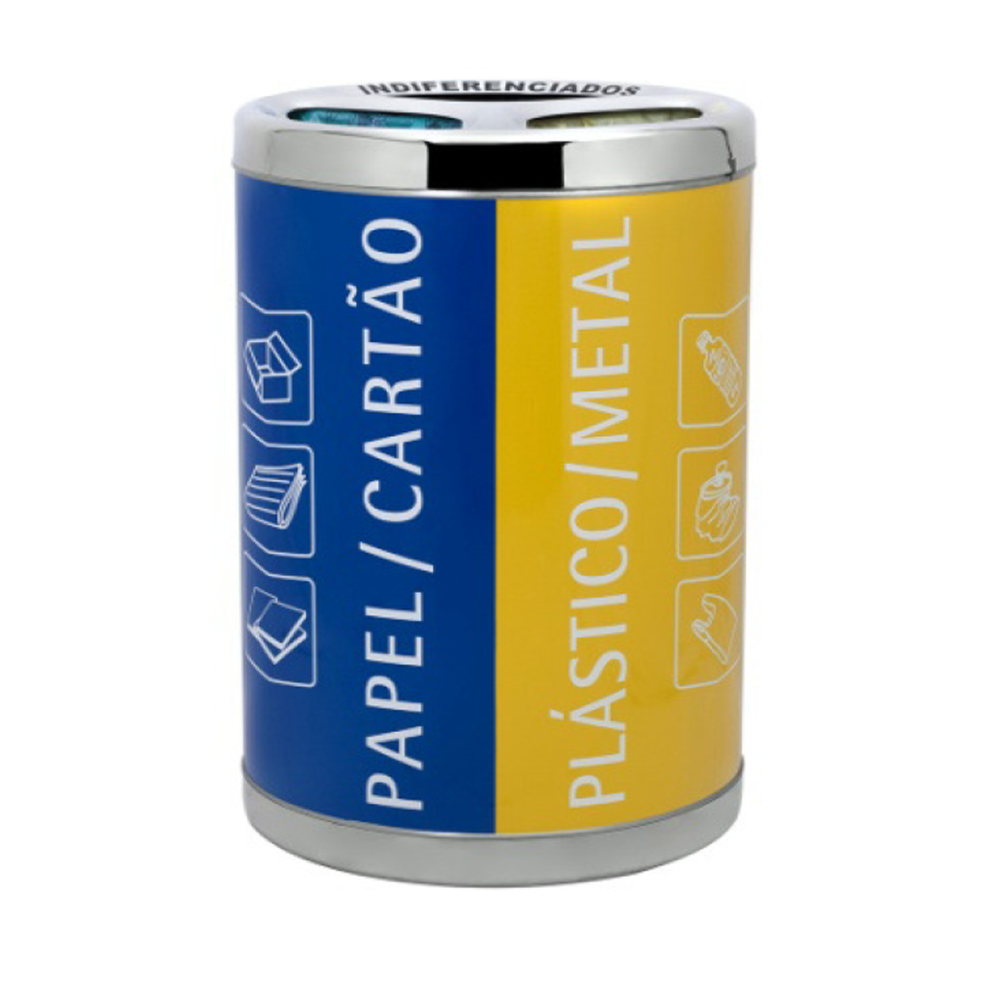 Eco – ponto de 3 entradas de reciclagem seletiva, totalmente construído em aço inox AISI 304 com corpo revestido a vinil e fundo e cabeça em aço inox polido. Estrutura em varão no interior para suspender os sacos plásticos. Apoios de borracha ao solo na parte inferior do ecoponto.