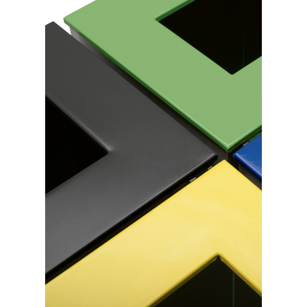 Cada contentor tem capacidade para 40 litros e o bloco foi construído em chapa de aço e pintura epoxy, com o nome de cada material reciclável na lateral. As tampas deste ecoponto são articuladas com dobradiça, pintadas à cor da reciclagem selectiva.