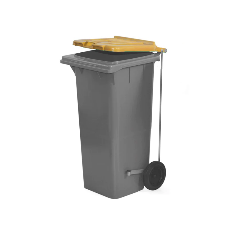 Contentor com rodas e capacidade para 120 litros com tampa amarela.