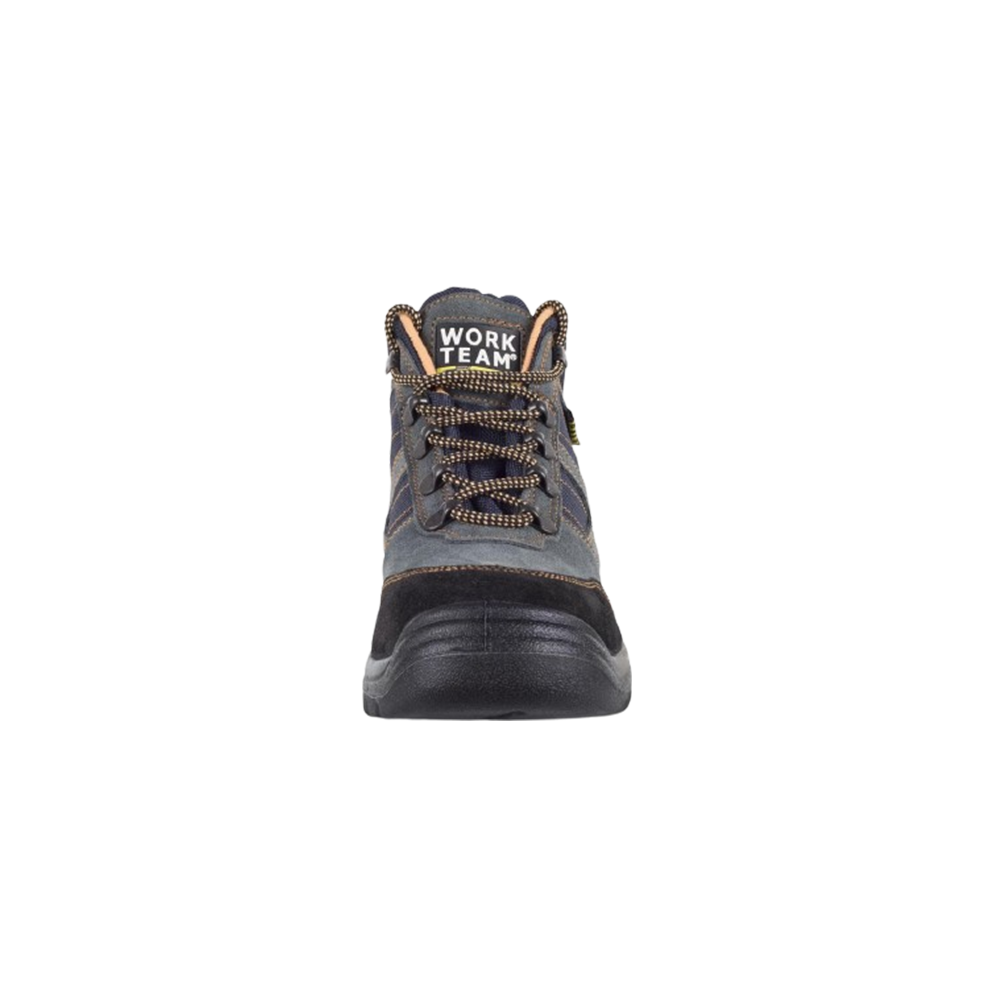 Bota de croute e lona com cordões, biqueira e palmilha de aço.