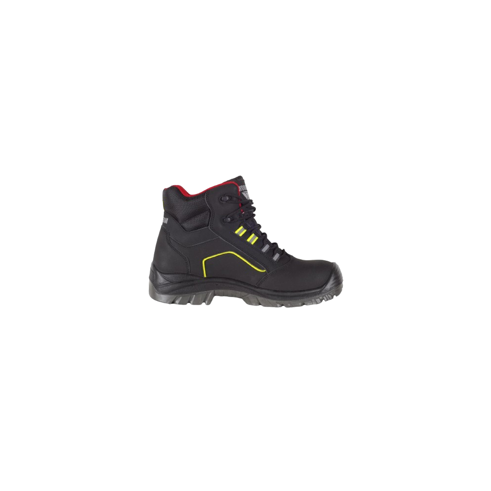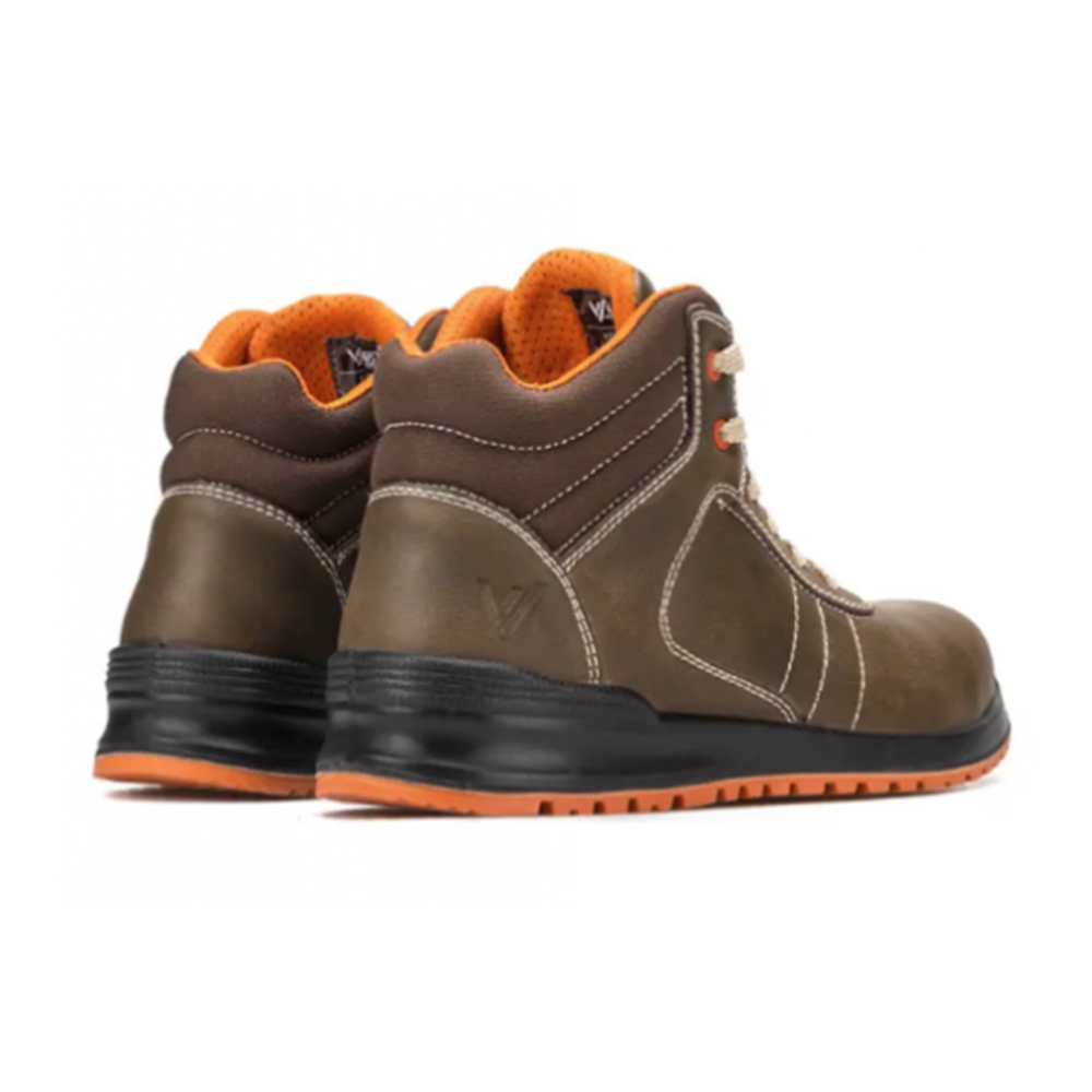 Bota de croute com cordões. Tipo trekking. Sola PU bidensidade. Biqueira e palmilha de aço. Propriedades antiestáticas. Absorção da energia naz ona do salto. Resistente aos hidrocarbonetos. Resistente à perfurãçao. Resistência ao deslizamento sobre ladrilho cerâmico com dissolução de sabão e sobre aço com glicerina.